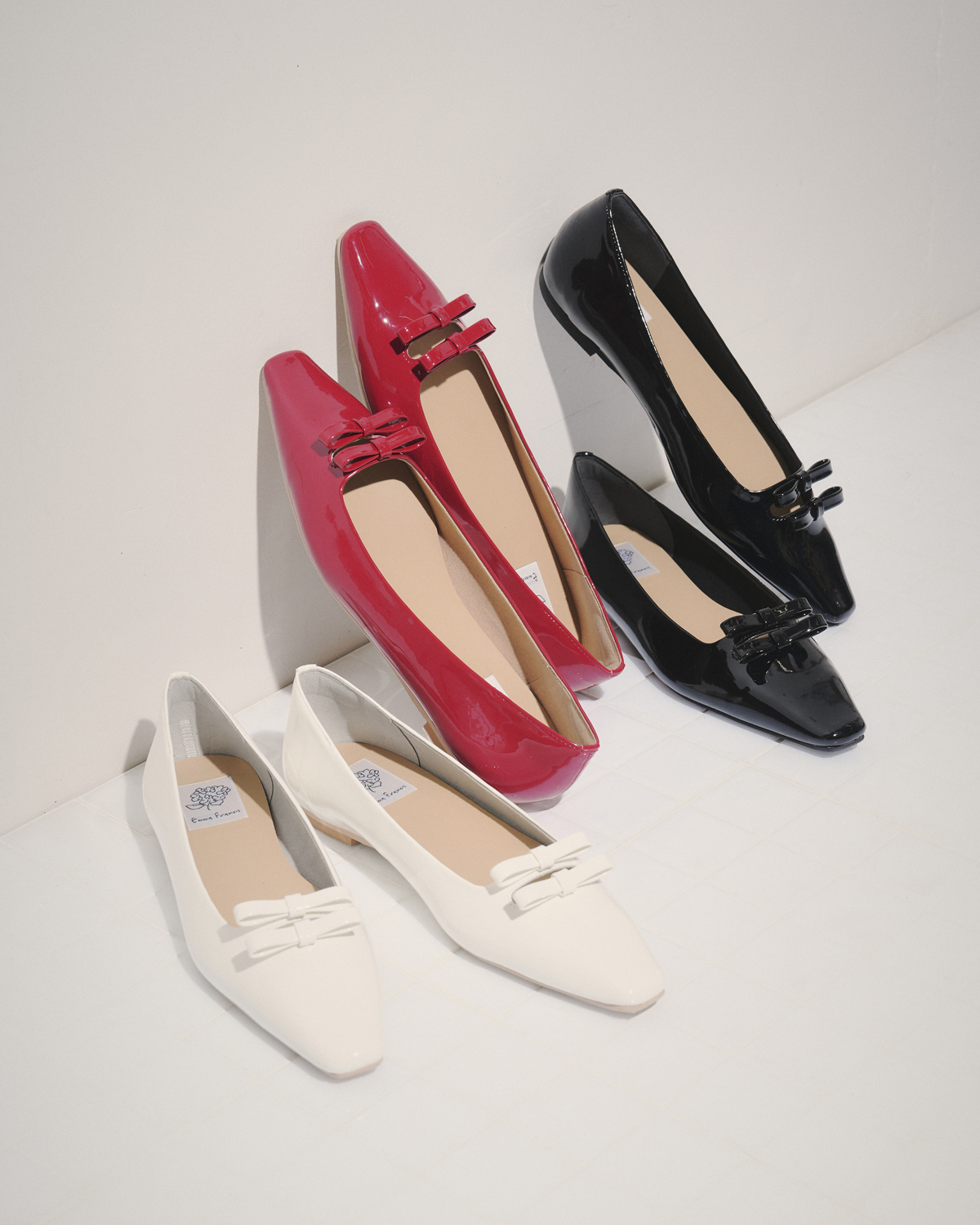 小ぶりなふたつのリボンがフェミニンな印象をプラス